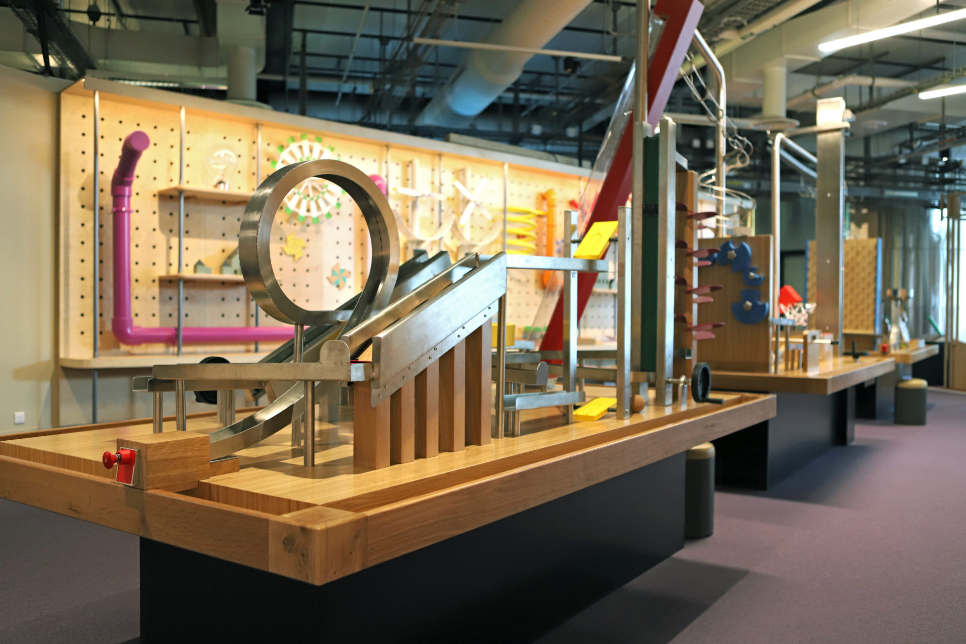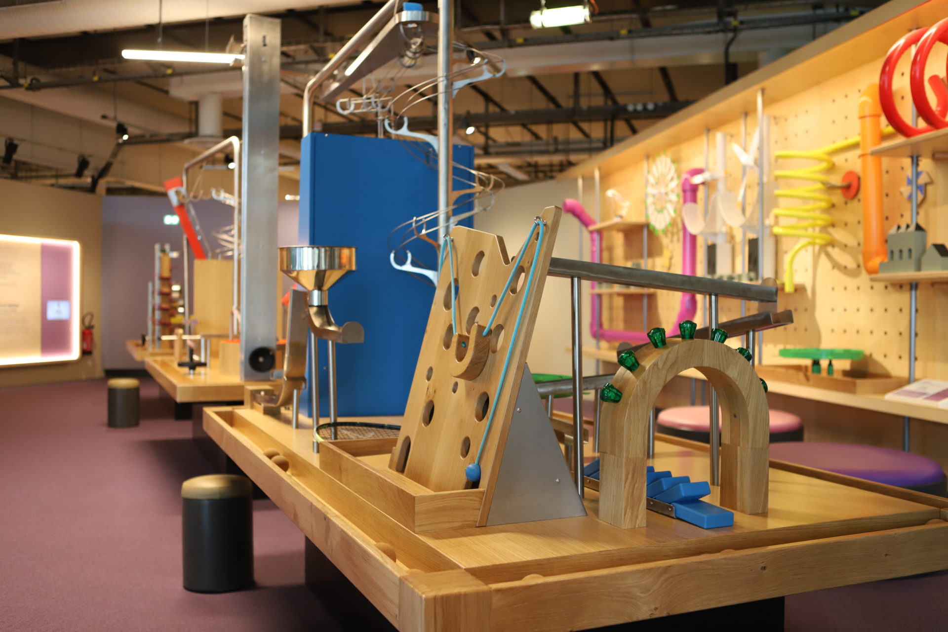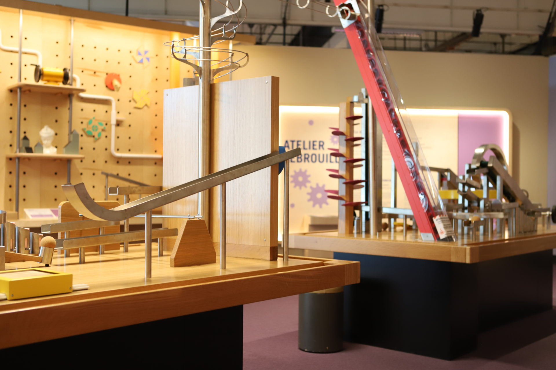 Expérimenter, essayer, tester, manipuler, comprendre, réfléchir et se tromper, les tables de l'atelier "débrouille" de la Cité des enfants à la Cité des Sciences et de l'Industrie, offrent toutes ces actions au jeune public. En association avec l'agence Les Crayons et les équipes de la Cité des Sciences et de l'Industrie, nous avons imaginé un espace mettant en scène le principe de "réaction en chaîne". Looping, planche de Galton, rampes, ascenseur, escaliers, propulseurs, sont autant d'agrès que les enfants doivent découvrir et appréhender pour avancer sur les tables. Mises en forme par l'entreprise Matières à penser, l'atelier "Débrouille" puise ses inspirations dans l'univers de Rube Goldberg, détournant des objets pour en créer des réactions en chaîne.