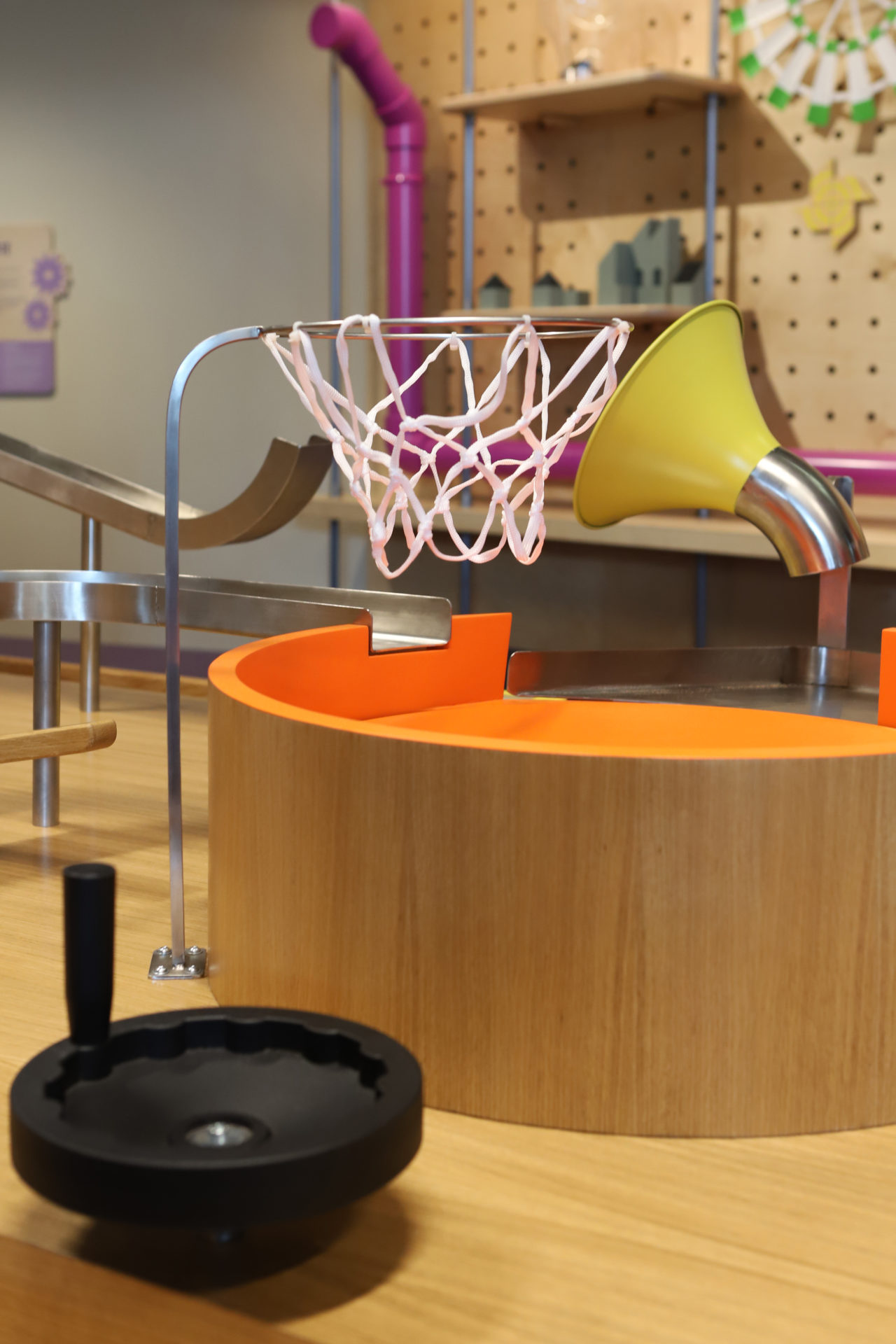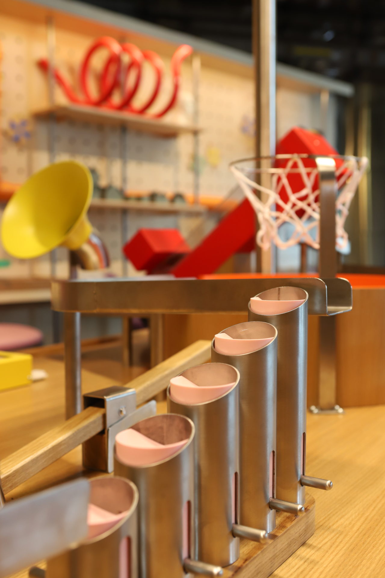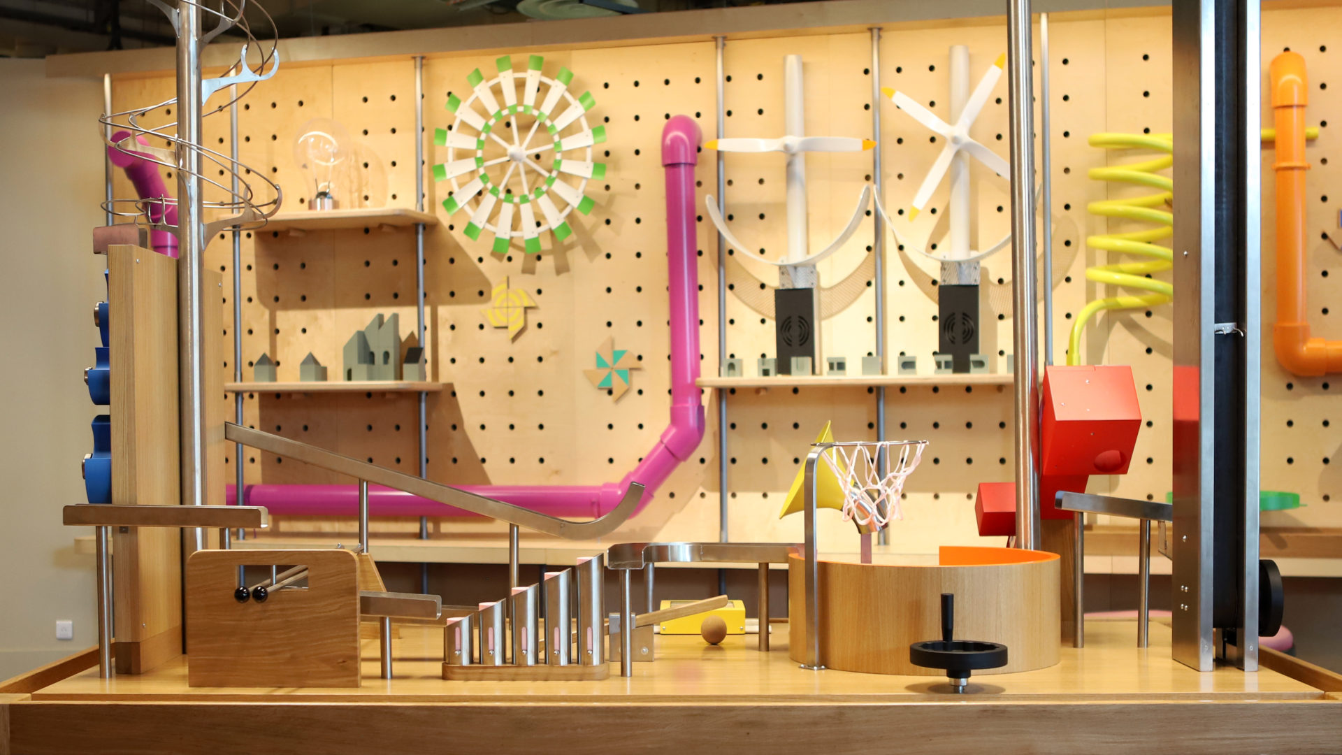Expérimenter, essayer, tester, manipuler, comprendre, réfléchir et se tromper, les tables de l'atelier "débrouille" de la Cité des enfants à la Cité des Sciences et de l'Industrie, offrent toutes ces actions au jeune public. En association avec l'agence Les Crayons et les équipes de la Cité des Sciences et de l'Industrie, nous avons imaginé un espace mettant en scène le principe de "réaction en chaîne". Looping, planche de Galton, rampes, ascenseur, escaliers, propulseurs, sont autant d'agrès que les enfants doivent découvrir et appréhender pour avancer sur les tables. Mises en forme par l'entreprise Matières à penser, l'atelier "Débrouille" puise ses inspirations dans l'univers de Rube Goldberg, détournant des objets pour en créer des réactions en chaîne.